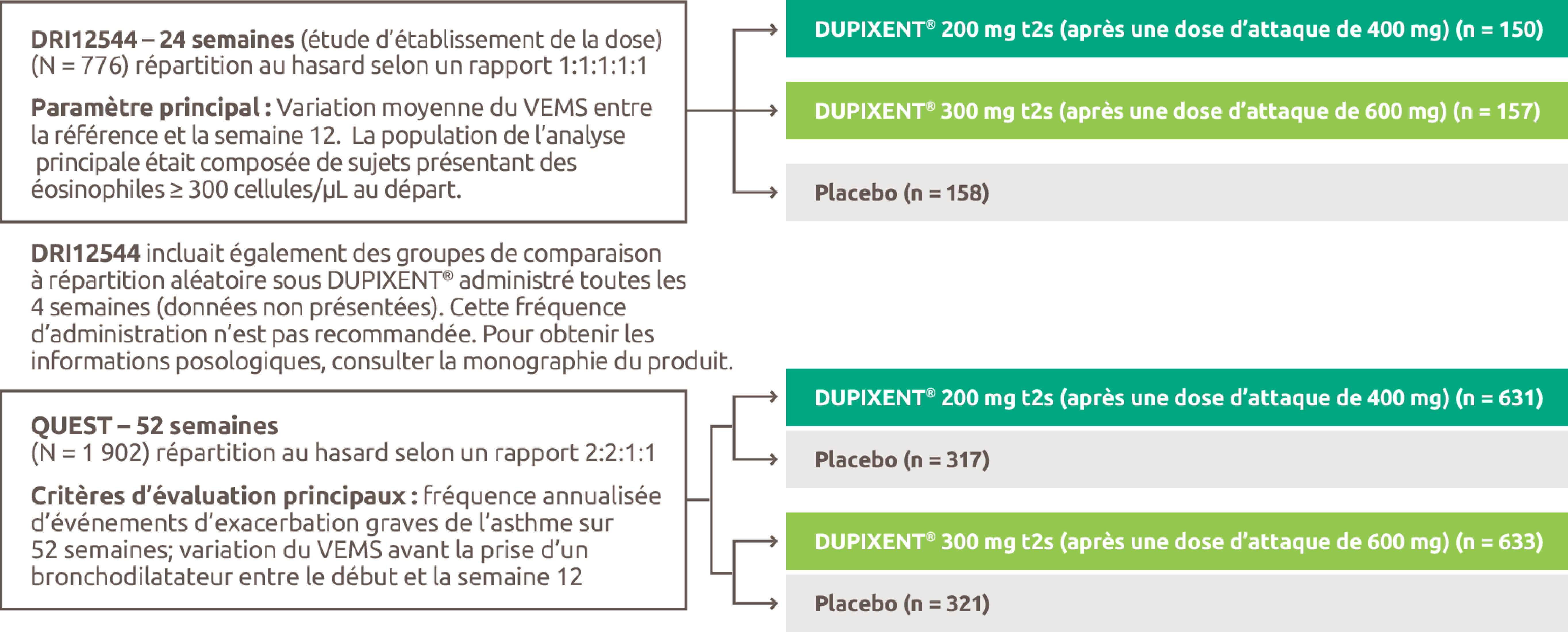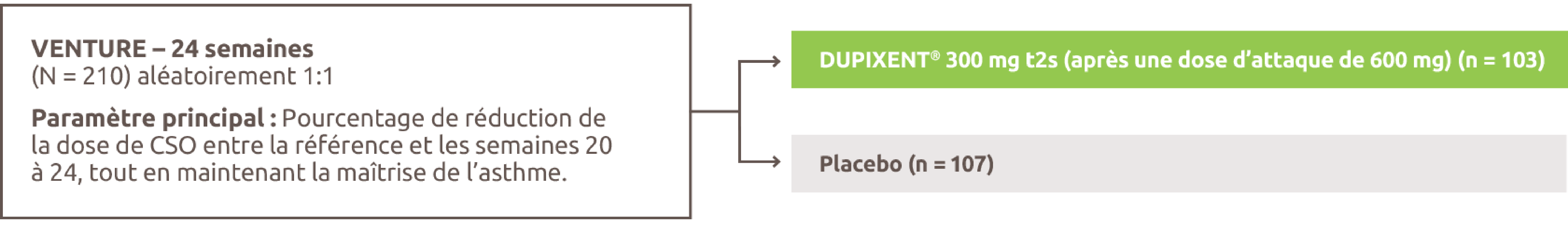 Dans l’étude VENTURE, les sujets admis recevaient des corticostéroïdes inhalés à dose élevée jumelés à un ou des médicaments de prévention supplémentaires. Tous les sujets recevaient des CSO. Suivant l’optimisation de la dose de CSO (période de sélection), les sujets ont été répartis au hasard et ont continué de recevoir leur antiasthmatique habituel pendant l’étude; cependant, leur dose de CSO a été réduite toutes les 4 semaines au cours d’une phase de réduction de la dose des CSO (semaines 4 à 20), si la maîtrise de l’asthme était maintenue. La maîtrise de l’asthme était jugée maintenue si le sujet n’avait pas présenté i) d’augmentation ≥ 0,5 unité de son score ACQ-5, ii) d’exacerbation grave de l’asthme ou iii) d’événement d’importance clinique ayant nécessité un ajustement de sa dose de CSO. Les patients ont été admis sans devoir présenter un minimum d’éosinophiles sanguins au départ ou d’autres biomarqueurs inflammatoires de type 2.